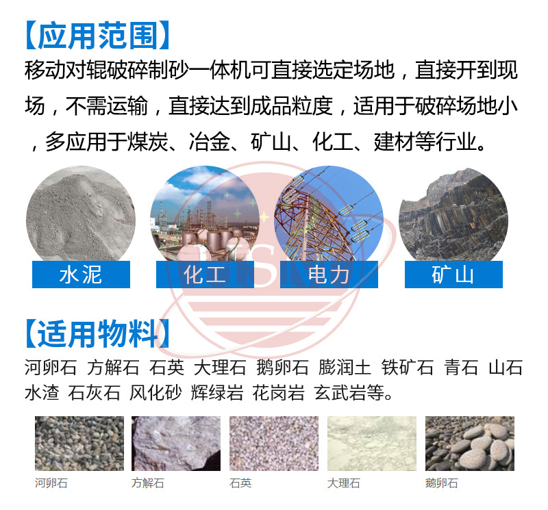 • 適用物料:河卵石、方解石、石英石、大理石、鵝卵石、膨潤土、鐵礦石、青石、山石、水渣、石灰石、風化砂、輝綠巖、花崗巖、玄武巖